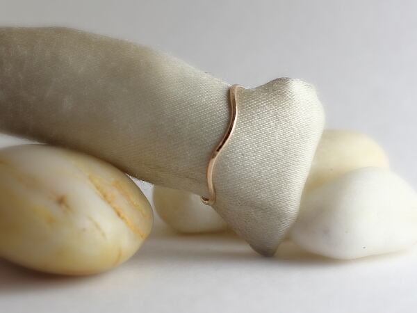 ひとつひとつ手で14Kゴールドフィルド0.8mm線を鍛造し強弱アクセントをつけた極細身のリング。送料無料。